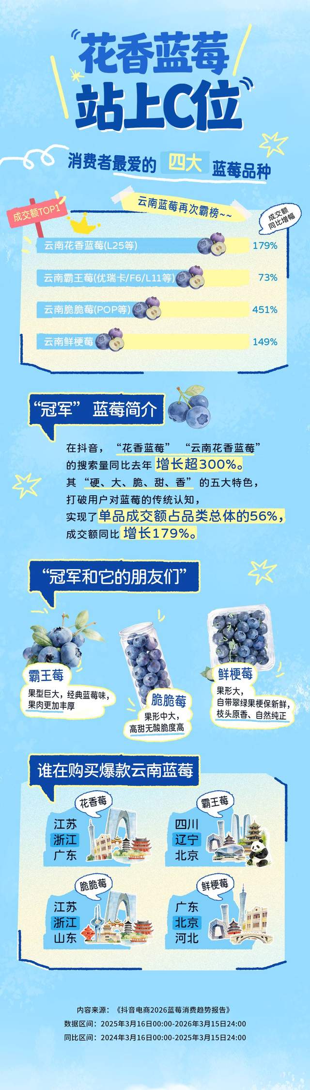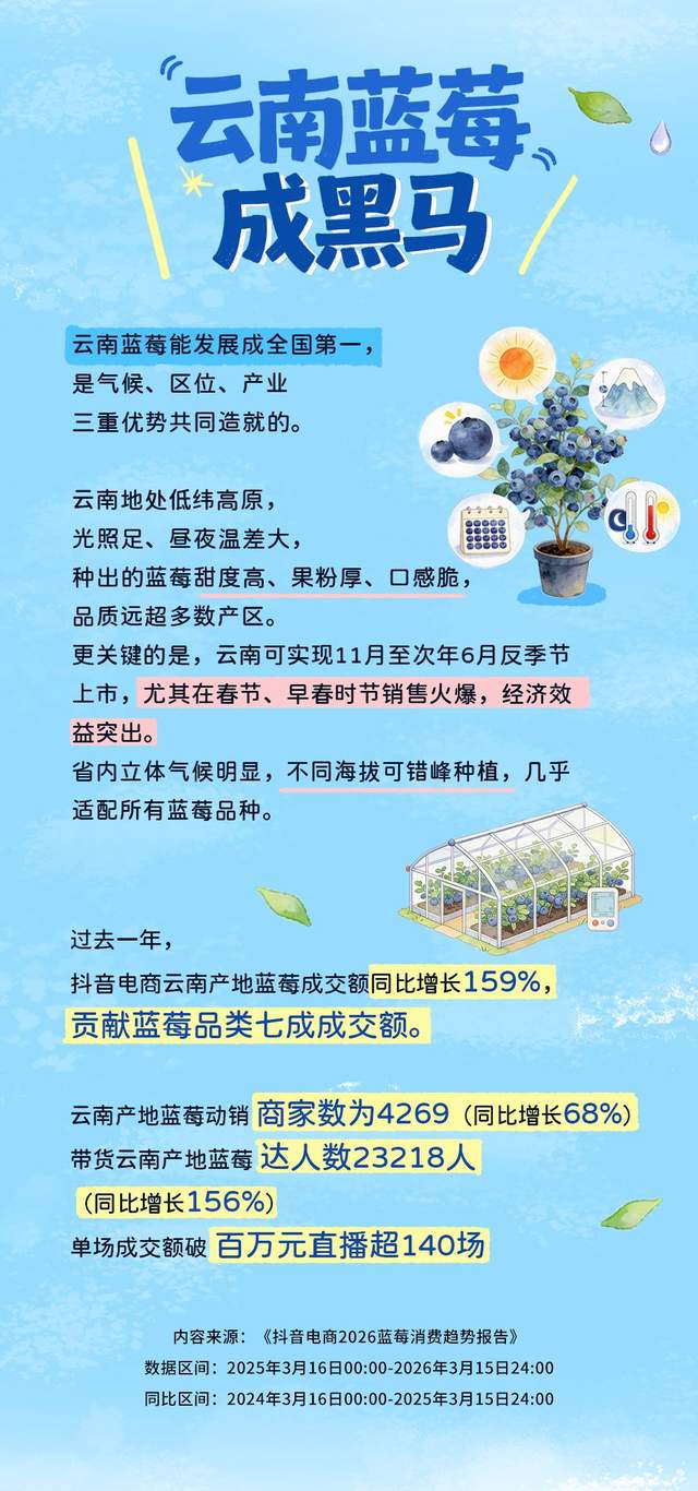 地处低纬高原,云南光照足、昼夜温差大,种出的蓝莓甜度高、果粉厚、口感脆。更关键的是,云南可实现11月至次年6月反季节上市,独占春节、早春高价市场,经济效益突出。《报告》显示,过去一年,抖音电商云南产地蓝莓成交额同比增速高达159%,贡献蓝莓品类七成成交额。