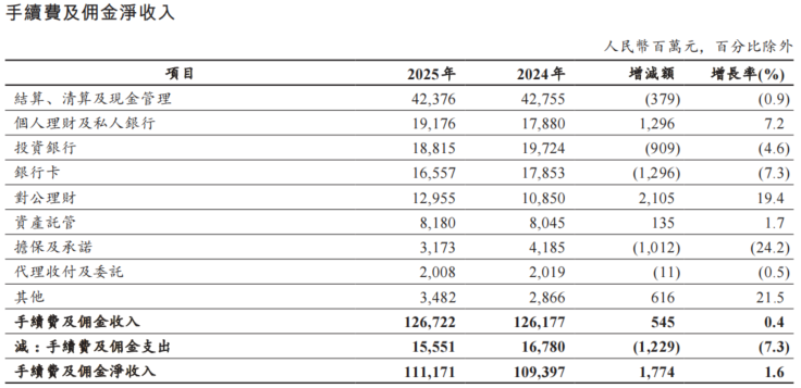非利息收入方面,2025年该行实现非利息收入1662.69亿元,同比增长11.8%,占营业收入20.7%。其中,手续费及佣金净收入1111.71亿元,同比增长1.6%,结束了此前连续3年下跌趋势;其他非利息收益550.98亿元,增加157.74亿元,增长40.1%。
