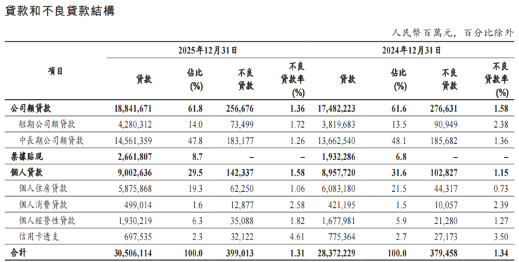分业务看,2025年末,该行公司类贷款不良率为1.36%,较上年末下降0.22个百分点,但个人贷款不良率为1.58%,较上年末上升0.43个百分点。