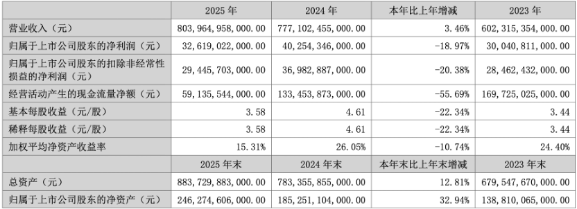 3月27日,比亚迪股份有限公司(比亚迪,002594.SZ;01211.HK)公告称,2025全年实现营收8039.65亿元,同比增长3.46%;归属于上市公司股东的净利润326.19亿元,同比下降18.97%;基本每股收益为3.58元;董事会审议通过的利润分配预案为向全体股东每10股派发现金红利3.58元(含税)。