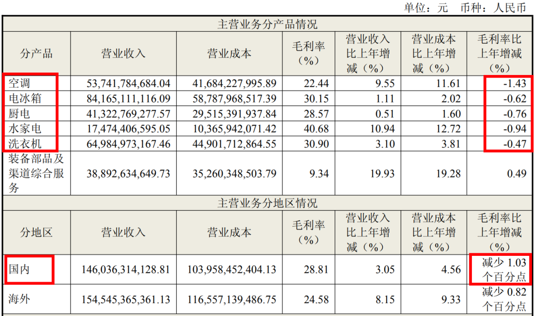 美的、格力等竞争对手纷纷降价促销,海尔为了保住市场份额,不得不跟进降价,再加上原材料铜、铝等价格上涨,毛利率被双重挤压。