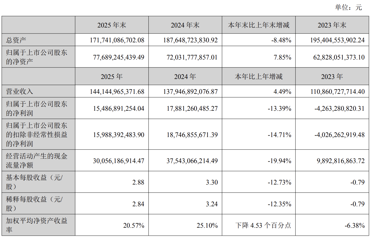 从财务结果看,归属于上市公司股东的扣除非经常性损益净利润为159.88亿元,同比下降14.71%;基本每股收益2.88元,同比下降12.73%。