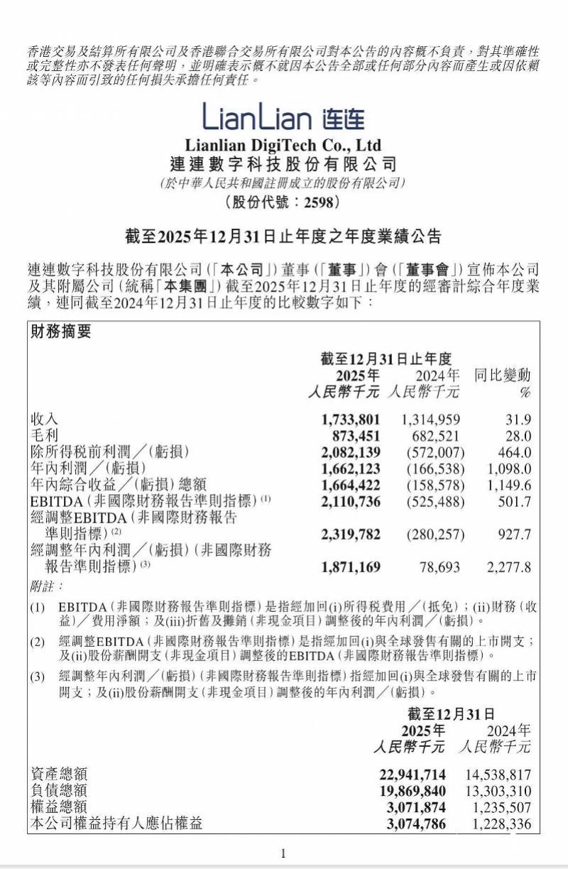 连连数字2025年的成绩单可谓亮眼。业绩报告显示,截至2025年12月31日,连连数字全年总收入达到17.34亿元,同比增长31.9%,创历史新高;毛利同比增长28%至8.73亿元。净利润则扭亏为盈,从2024年的亏损1.67亿元增长到2025年的盈利16.62亿元。公司资产总额达229.42亿元,现金及现金等价物16.28亿元。