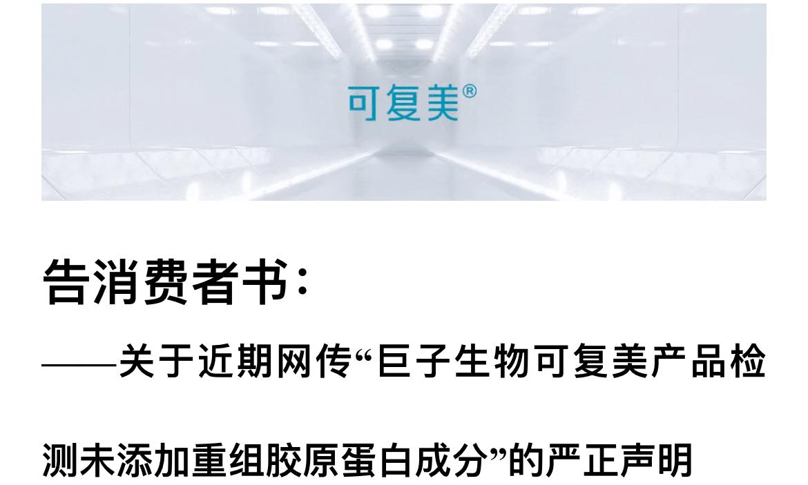 面对质疑,可复美连夜发布“告消费者书”,称其已第一时间对相关产品进行检测,多批次产品检测结果显示,胶原蛋白含量均大于0.1%,与网传的“0.0177%添加量”严重不符。