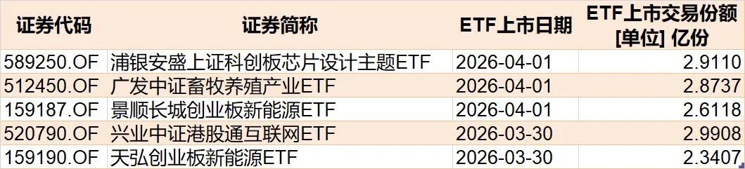 目前有5只ETF披露下周上市,跟踪标的为创业板新能源、港股通互联网、畜牧养殖、科创板芯片设计等。