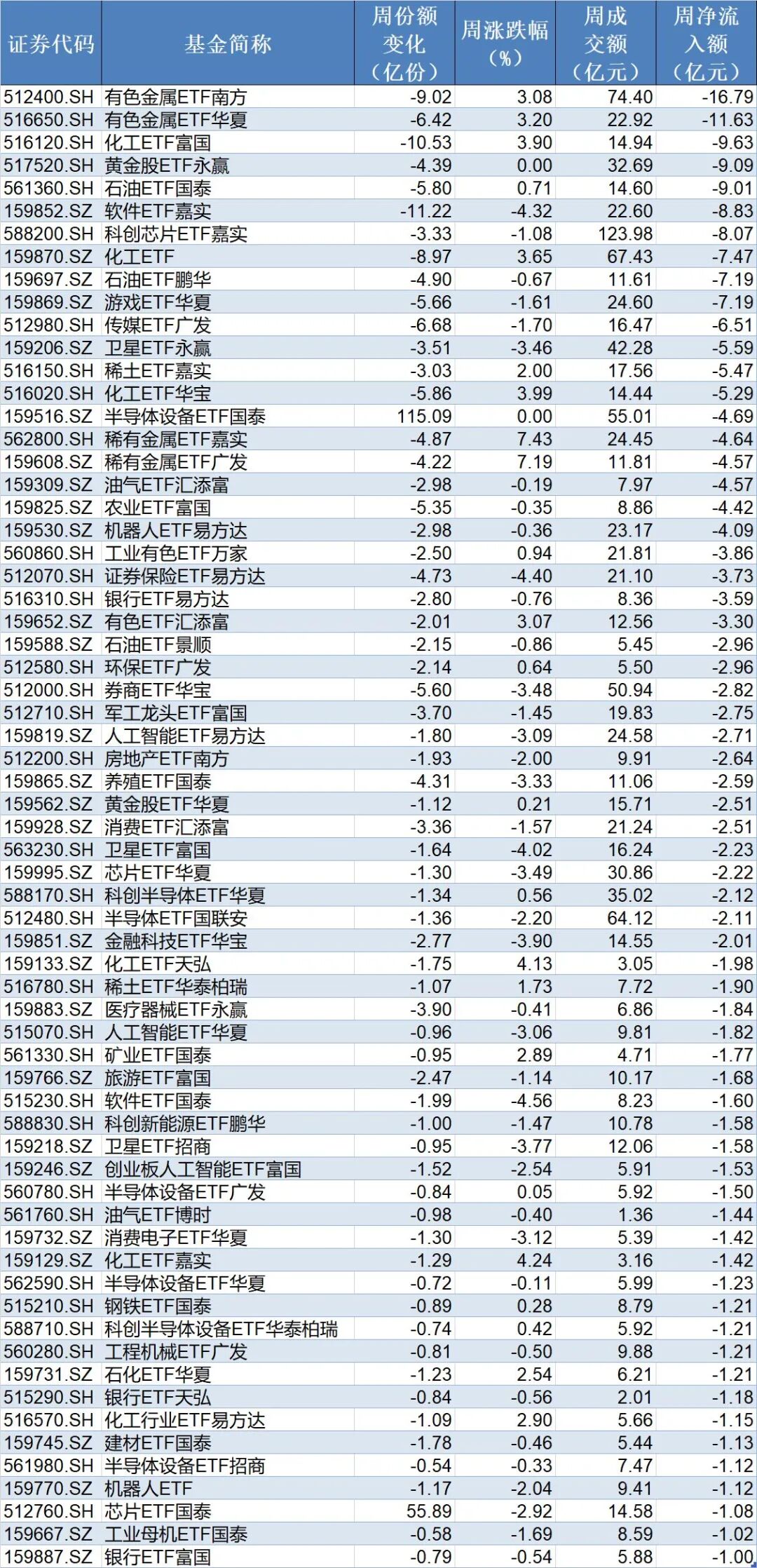 在资金流出方面,本周有65只行业主题ETF净流出逾1亿元,其中有色金属ETF南方、有色金属ETF华夏、化工ETF富国份额分别减少9.02亿份、6.42亿份和10.53亿份,分别净流出资金16.79亿元、11.63亿元和9.63亿元。