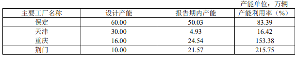 产能利用率方面,长城汽车保定工厂为83.39%,天津工厂为16.42%,重庆工厂为153.38%,荆门工厂为215.75%;上年同期分别为78.02%、35.51%、134.02%、159.4%。