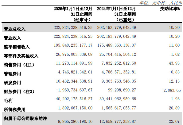 2025年,长城汽车实现营业总收入2228.24亿元,同比增长10.2%;归母净利润98.65亿元,同比降低22.07%;扣非净利润60.59亿元,同比下降37.5%;综合毛利率17.81%,同比减少1.61个百分点。