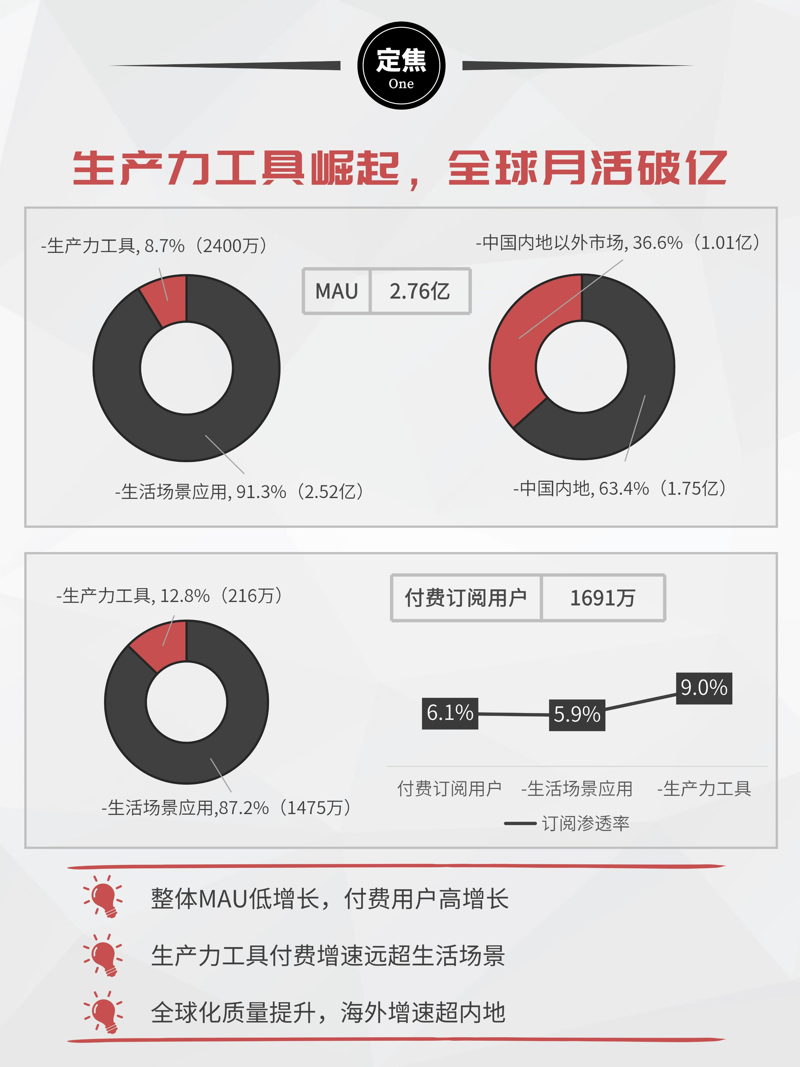 用户指标方面,截至2025年末,月活跃用户(MAU)达2.76亿,同比增长3.8%。其中中国内地以外市场MAU突破1亿,同比增长6.3%。付费订阅用户达1691万,同比增长34.1%,订阅渗透率从4.7%提升至6.1%。生产力工具付费用户同比增长67.4%至216万,渗透率达9.0%。