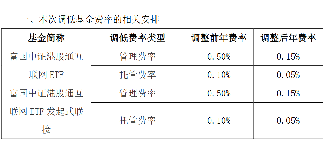 根据富国基金公告,港股通互联网ETF富国及其联接基金将管理费率从0.5%调低至0.15%,同时将托管费率从0.1%调低至0.05%。调整后的管理费率和托管费率均是目前全市场ETF中的最低一档。