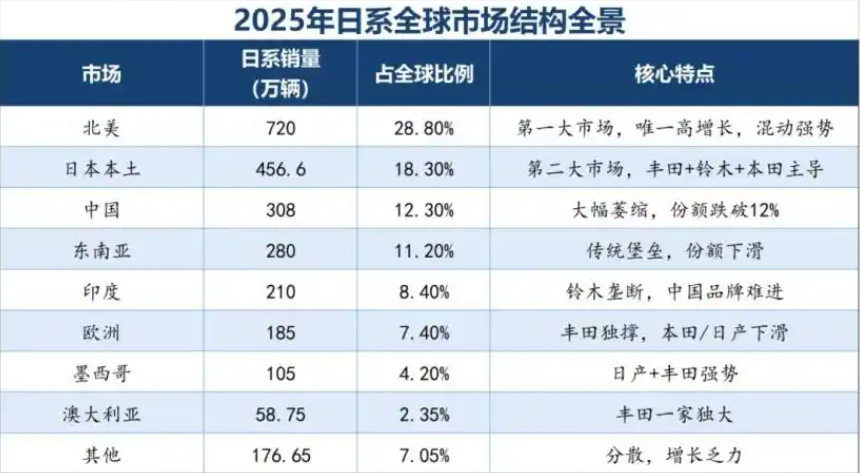 更关键的是,在北美这一全球核心汽车市场,中国车企几乎未能突破。美国、加拿大对中国电动车征收超过100%的关税,使得这片日系车最稳固的“第二故乡”——2025年日系在北美销量达720万辆,占其全球总销量约28%——成为中国车企难以逾越的屏障。值得留意的是,加拿大最近决定将中国电动车的关税降至6.1%,并给出4.9万辆的年度配额,这虽然只是一个小缺口,却也为未来的突破提供了想象空间。