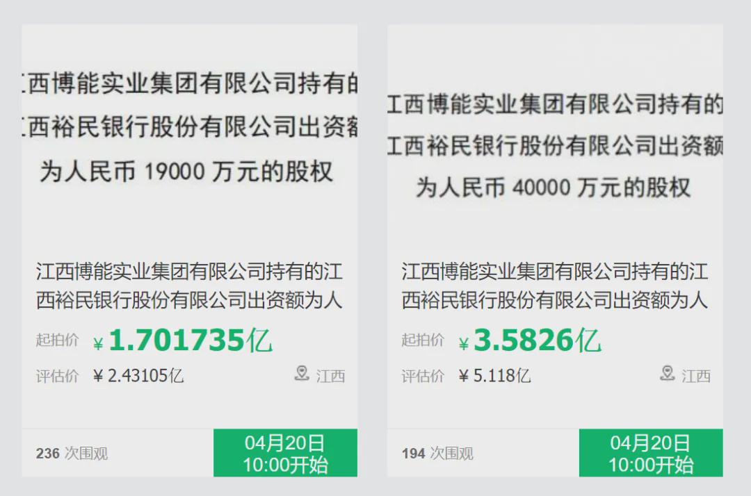 据中拍平台司法拍卖显示,江西博能实业集团有限公司持有的江西裕民银行出资额为人民币40000万元、19000万元的股权将于2026年4月20日进行公开拍卖,评估价分别为5.12亿元、2.43亿元,合计7.55亿元,分别以3.58亿元、1.70亿元起拍,合计5.28亿元,较评估价折价30%。