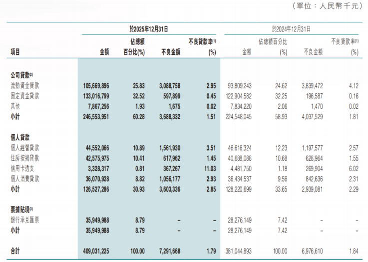 资产质量方面,2025年末,该行不良率为1.79%,较上年末下降0.05个百分点。其中,公司贷款不良率较上年末下降0.3个百分点至1.51%;个人贷款不良率则从上年末的2.29%上升至2.85%,其中信用卡不良率最高,达11.03%。