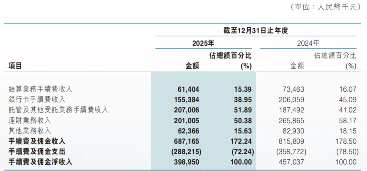 具体来看,全年该行理财业务收入同比下降24.4%至2.01亿元,银行卡手续费收入同比下降24.6%至1.55亿元,而托管及其他受托业务手续费收入则同比增长10.4%至2.07亿元。