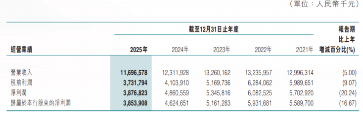 日前,东莞农商行发布2025年年报。2025年,该行营业收入116.97亿元、净利润达38.77亿元,分别较上一年下降5%、20.24%,营收、净利润延续上一年双降趋势。其中,利息净收入88.27亿元,同比下降3.78%;手续费及佣金净收入3.99亿元,同比下降12.71%。