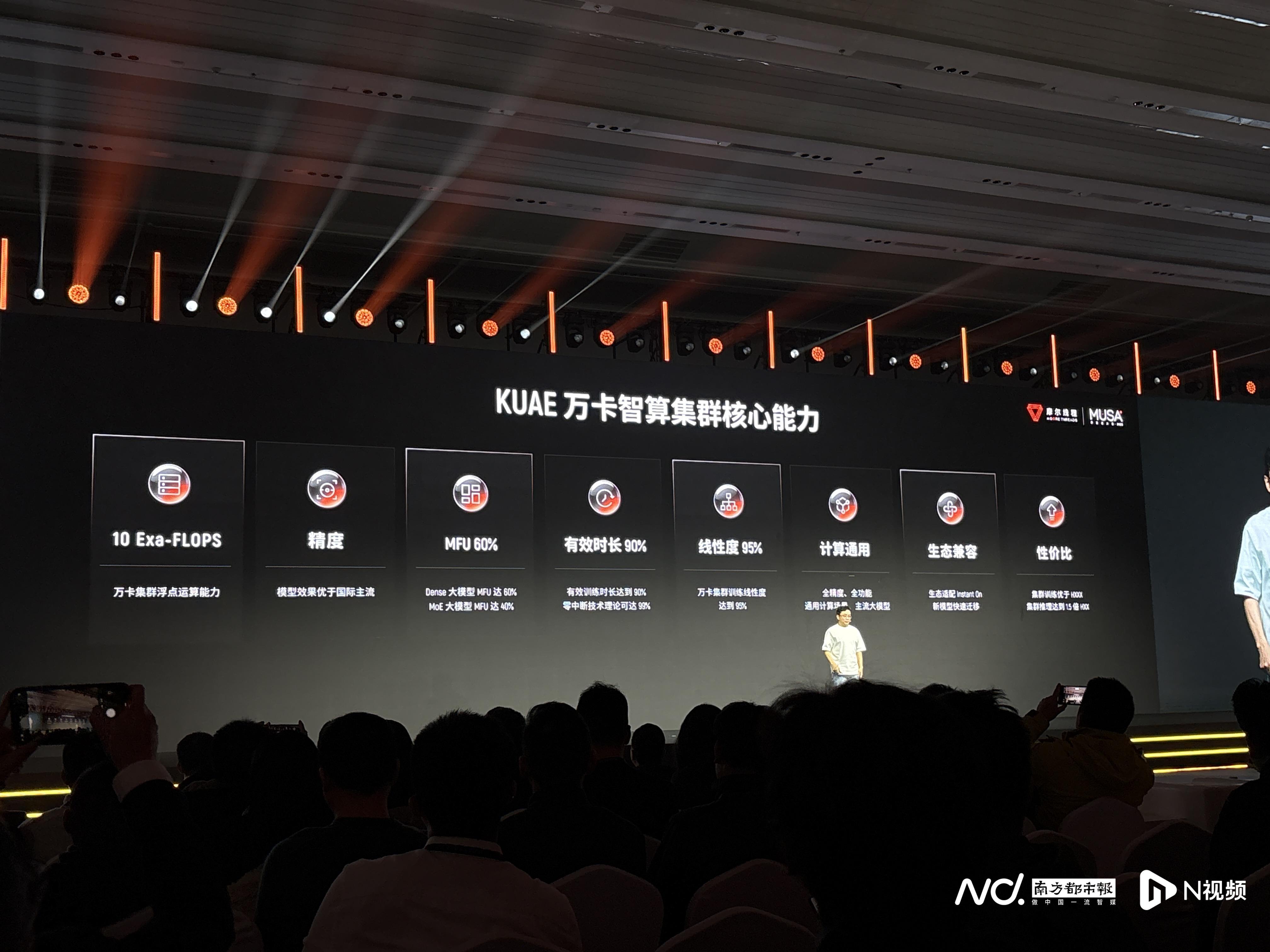 2025年12月20日,摩尔线程在公司的开发者大会上发布万卡智算集群方案,基于2025年量产的“平湖”架构S5000芯片打造,其浮点运算能力为10EFlops(1EFlops代表每秒百亿亿次浮点运算)。摩尔线程方面称,该智算集群支撑万亿参数模型训练。