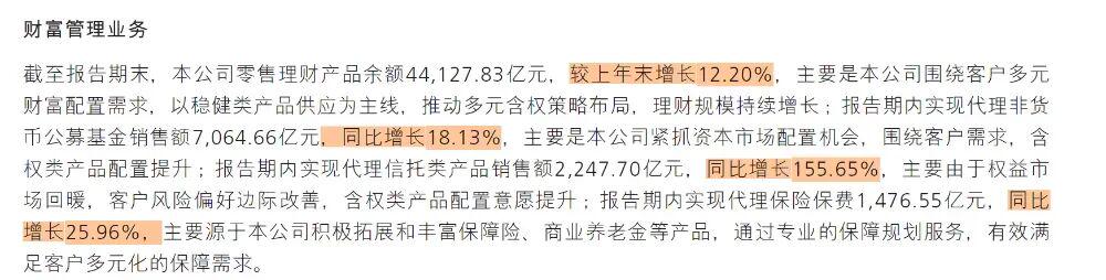 招行的零售存款余额达到 4.27 万亿元,同比增长 11.49% 。存款还在涨,但增速比前两年放 缓了。与此同时,招行的财富管理手续费及佣金收入达 267.11 亿元,同比大增 21.39% 。代销理财收入更是同比增长超过 18.98 % 。