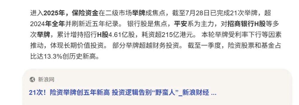 这就是为什么过去两年,银行股、水电股、高速公路股这些红利板块持续受到资金追捧的底层逻辑。 举个例子 ,在 2025 年,平安人寿先后 多次 举牌了 银行股 , 其 逻辑就是长期稳定的股息回报。