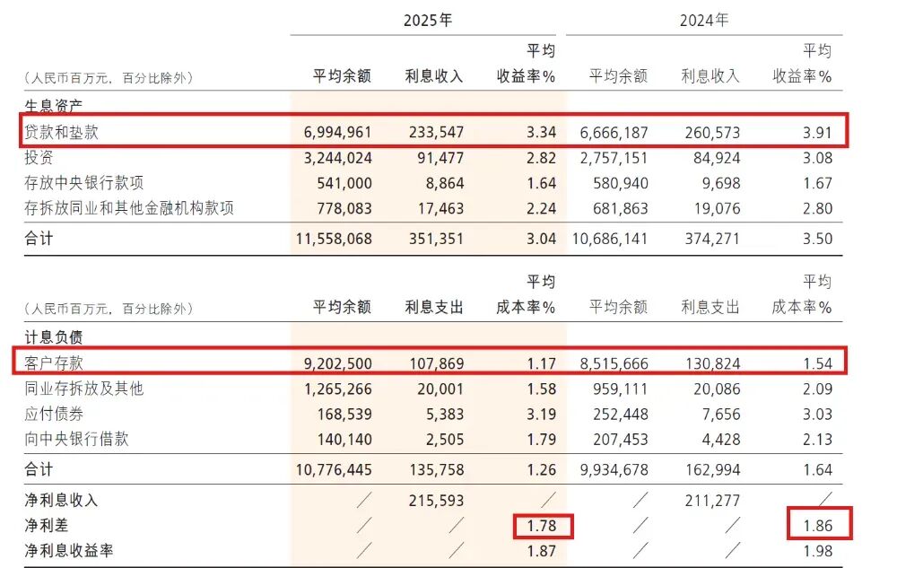 2025 年招行净利差 1.78% ,较 2024 年的 1.86% 下降了 8 个基点;净利息收益率 1.87% ,较上年的 1.98% 下降了 11 个基点。