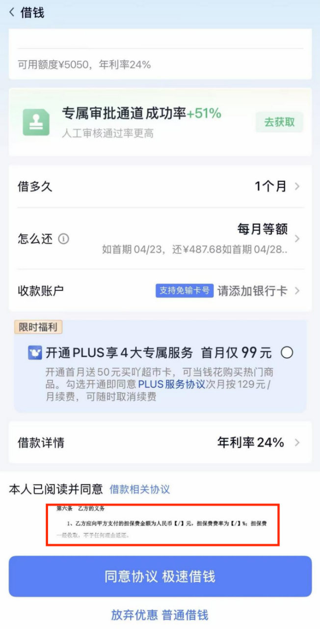 而为了规避法定的利率上限,助贷机构往往通过服务费、担保费等名目收取费用。例如,在借款页面,仅有一个狭长空间展示委托担保合同,非常不方便查看合同条款。且担保费金额、担保费费率均用“【/】”表示,并备注“一经收取,不予任何理由返还”,让用户在申请借款时,难以知晓具体费用。