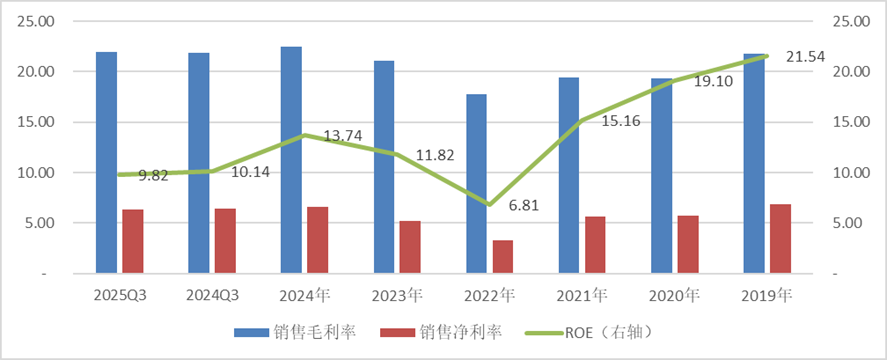 近年来,公司销售毛利率稳定在19%至22%之间,销售费率维持在5%至6%左右,2024年以来略有回落。
