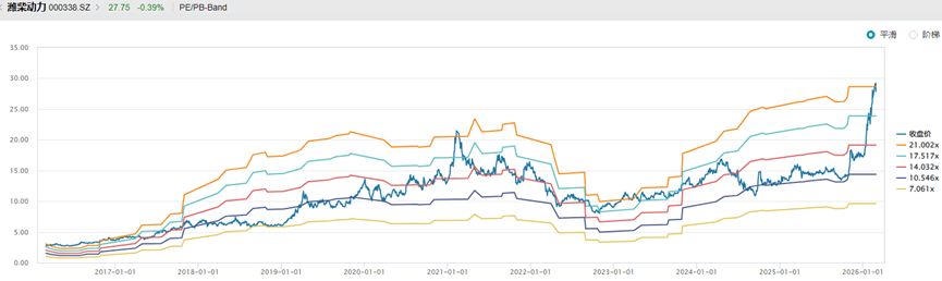 横向对比,建筑机械与重型卡车行业当前PE介于12倍至45倍之间,若结合2026年盈利预期,PE预期值介于11倍至32倍,多数公司集中在15倍PE左右。潍柴动力约处于行业均值水平。