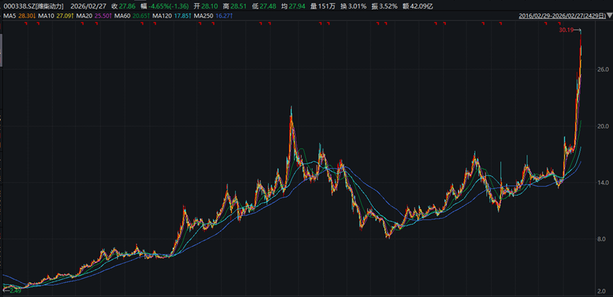 截止26年3月30日,潍柴动力收盘价24.43元,较十年前前复权价2.62元,上涨了将近10倍。考虑到最近几周最高点价格曾超过30元,十年10倍股当之无愧。