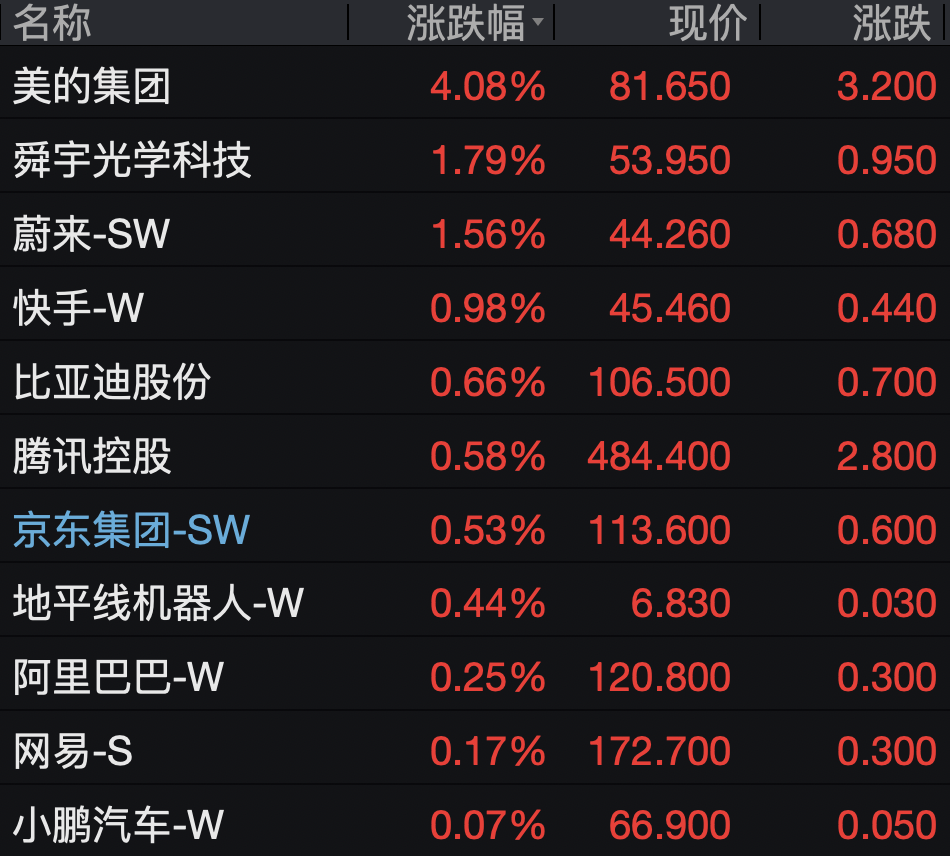 多只大型科网股反弹,美的集团涨超4%,蔚来涨超1%,快手、腾讯控股、京东集团、阿里巴巴、网易均上涨。