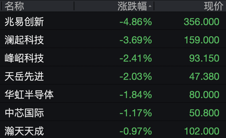 半导体、芯片股走弱,兆易创新跌近5%,澜起科技跌超3%,天岳先进、中芯国际、华虹半导体跌幅居前。