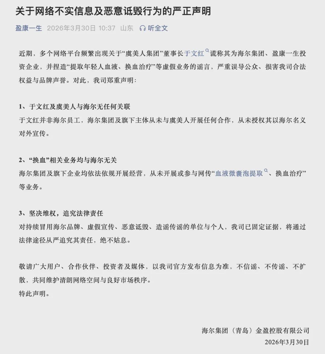 3月30日,盈康一生微信公众号发布了一则署名海尔金控的严正声明,指出近期关于“虞美人集团”董事长于文红谎称其为海尔集团、盈康一生投资企业,并捏造“提取年轻人血液、换血治疗”等虚假业务的谣言,已严重误导公众、损害了公司合法权益与品牌声誉。