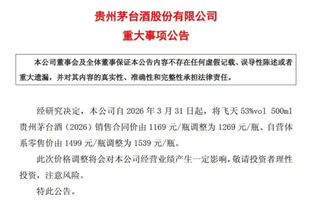 3月30日,贵州茅台发布重磅消息:自3月31日起,将飞天53%vol 500ml贵州茅台的经销商合同价由1169元提到1269元,自营零售价由1499元提到1539元。虽然只涨了100元和40元,但这是时隔八年后,茅台官方零售价首次上调。