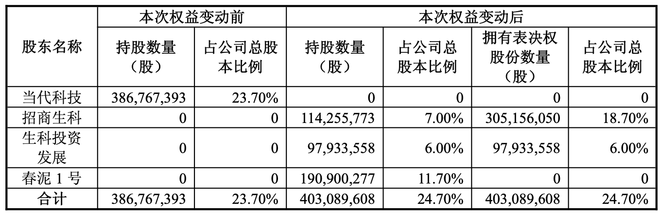 2025年年中,招商局集团招商生命科技(武汉)有限公司(下称“招商生科”)斥资118亿元,参与当代科技重整,具体通过招商生科、招商生科投资发展(武汉)合伙企业(下称“生科投资发展”)、中粮信托-春泥1号破产重整服务信托(下称“春泥1号”),合计拿下ST人福24.7%股份对应表决权。是年9月,持股1.6%的武汉高科国有控股集团有限公司(以下简称“武汉高科”),成为招商局集团新的一致行动人。