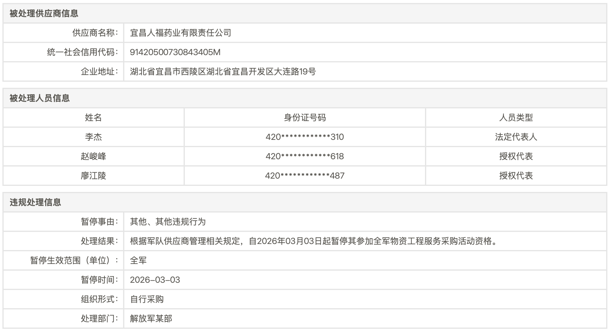 军队采购网显示,2026年3月3日,宜昌人福因“其他、其他违规行为”被暂停参加全军物资工程服务采购活动资格。