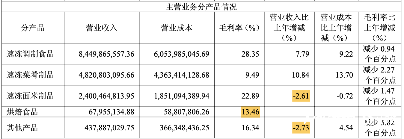 在营收有增有降时,2025年,安井食品多个系列产品还面临毛利率下滑的情况。其中,速冻调制食品毛利率下降0.94个百分点至28.35%,速冻菜肴制品毛利率减少2.27个百分点至9.49%;速冻面米制品毛利率减少1.47个百分点至22.89%;其他产品毛利率减少5.82个百分点至16.34%。而其最新布局的烘焙食品毛利率对比其他品类相对较低,为13.46%。2025年,安井食品整体毛利率同比下降了7.28个百分点至21.60%。
