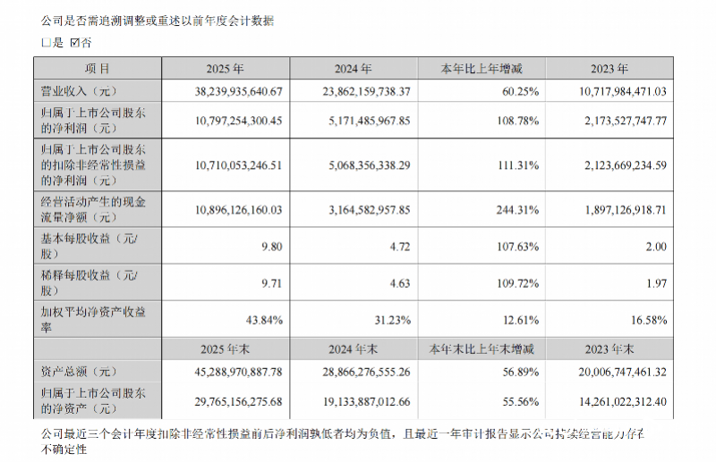 2025年,全球AI大模型迭代提速,海内外云厂商与科技巨头持续加大算力基础设施投入,高速光模块作为数据中心传输核心器件需求井喷。报告期内,中际旭创全年实现营业收入382.40亿元,同比增长60.25%;归母净利润107.97亿元,同比增长108.78%,业绩实现翻倍式增长,正式迈入百亿净利梯队。