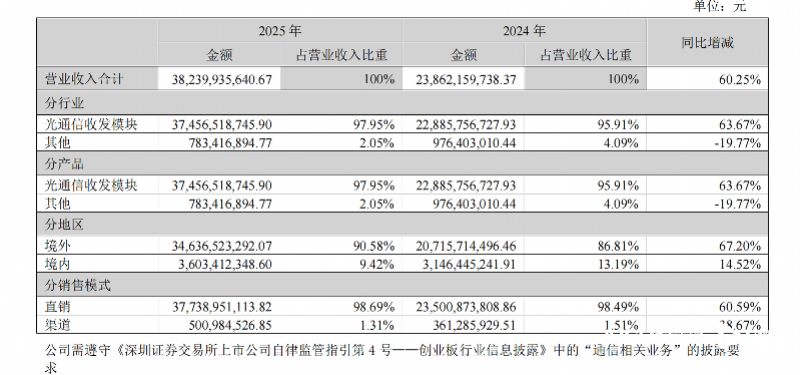 从业务结构来看,中际旭创主业高度聚焦,光通信收发模块业务实现收入374.57亿元,同比增长63.67%,占总营收比重高达97.95%,核心业务增长强劲,成为拉动公司整体业绩增长的绝对主力。