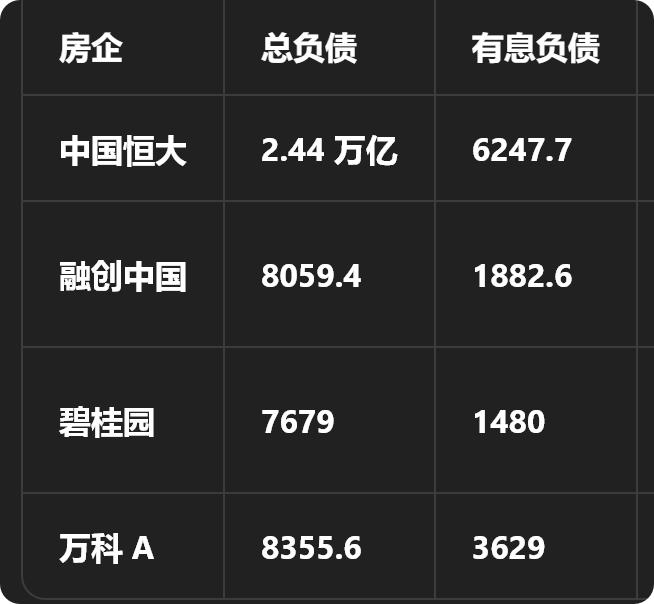 和其他头部房企一样,碧桂园的负债一样高企。此前长期雄踞房企前四的恒大、万科、碧桂园和融创中国,截至2025年年末总负债分别是2.44万亿元、8355.6亿元、7679亿元和8059.4亿元,碧桂园在四家房企巨头中负债最低,且有息负债只有1480亿元,其他三家的有息负债分别为恒大的6247.7亿元、万科的3629亿元和融创中国的1882.6亿元。碧桂园有息负债占总负债的比例只有19.3%,而恒大、万科和融创中国的占比分别是25.6%、43.4%和23.4%,碧桂园成为有息负债占比唯一一家低于20%的头部房企。
