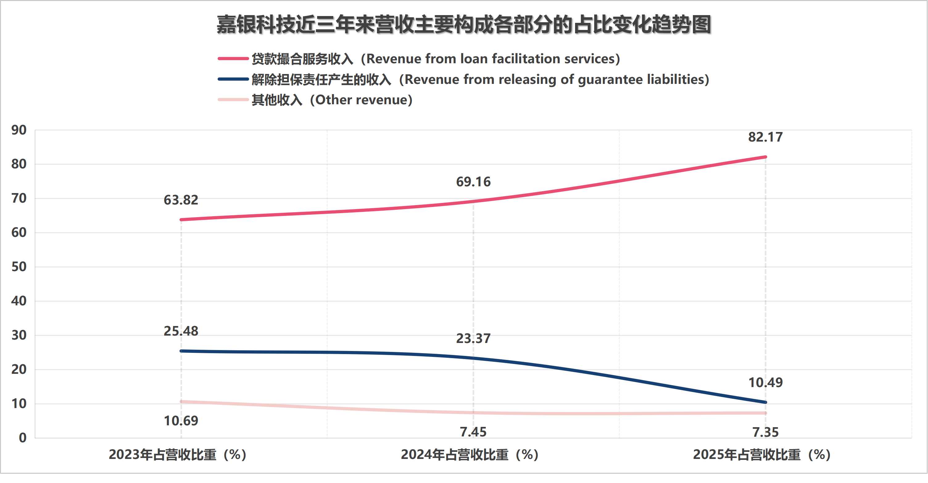 从2025年全年收入构成来看,嘉银科技与助贷业务息息相关的贷款撮合服务收入(Revenue from loan facilitation services)约为51.13亿元,同比增幅达27.4%,占全年营收的比重超过八成。新京报贝壳财经记者查询嘉银科技近三年来营收主要构成各部分的占比情况发现,只有贷款撮合服务收入的比重保持了持续增长。