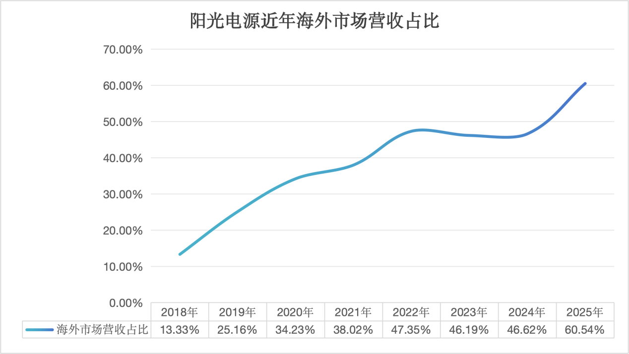 2025年公司来自海外地区的营收占比首次超过60%,较此前出现明显提升,且其中主要的贡献来自储能业务的海外市场开拓。