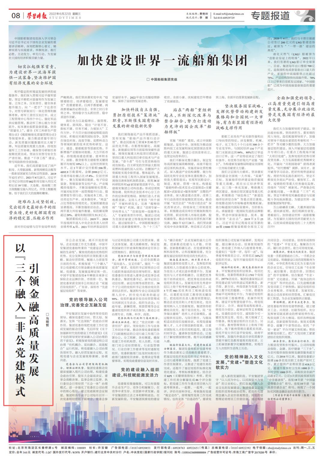 2022年6月22日,马明哲署名的另一篇文章刊登在《学习时报》上。该报是由中共中央党校主办,以各级党政干部和广大知识分子为主要对象,是国内外公开发行的全党唯一专门讲学习的报纸。
