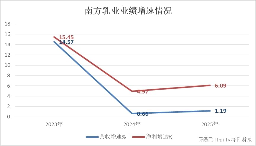 这种高度依赖单一区域的业务结构,直接导致增长空间受限。2022年至2024年,南方乳业营业收入从15.75亿元增至18.17亿元,但增速却从14.57%骤降至0.66%,几乎陷入停滞。2025年营收增速虽略有回升至1.19%,但增长乏力的态势并未根本扭转。