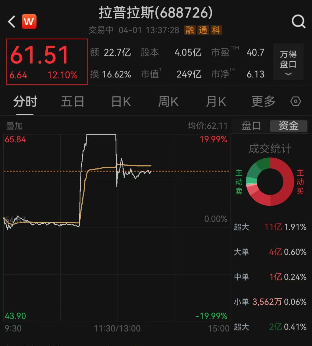 4月1日近11时,受一则“拉普拉斯中标特斯拉光伏项目第二期,订单规模近百亿”的报道影响,A股上市公司拉普拉斯(688726.SH)股价瞬间拉升,短短8分钟内日内涨幅从0.38%扩大至19.99%,一直到午间收盘封死涨停。