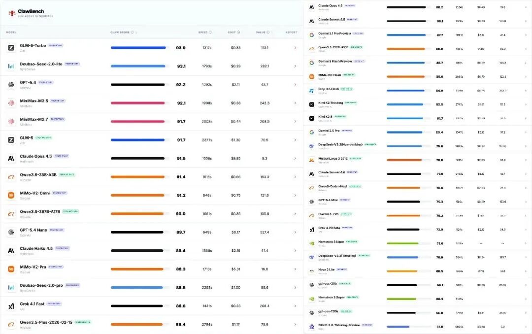 智谱 GLM-5-Turbo 以 93.9 分的 CLAW SCORE 登顶榜首,成为本次评测中综合表现最强的模型;字节跳动 Doubao-Seed-2.0-lite 以 93.1 分位居第二,其使用成本仅为 $0.33,为全榜最低;小米 MiMo-V2-Omni 以 91.2 分排名第 9,运行速度为全榜最快,仅需 848 秒完成全套任务流程。
