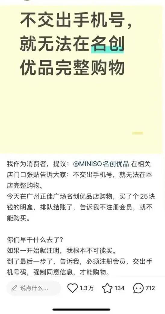 近期,多名网友反映,在名创优品消费时,被店员要求必须注册会员,否则无法结账,相关话题迅速引发热议。随后多名网友发帖称,在购买盲盒等潮玩类产品时被要求出示会员码。还有网友表示,在购买非盲盒品类时也被要求注册会员才能购买。