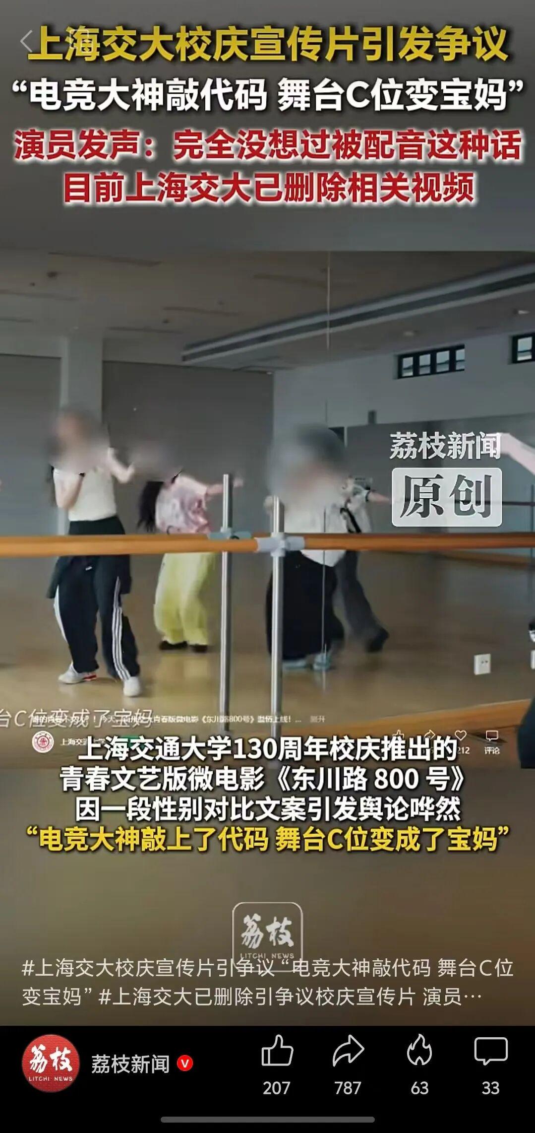 近日,上海交通大学130周年校庆推出的青春文艺版微电影《东川路 800 号》,“电竞大神敲上了代码, 舞台C位变成了宝妈”,这一段文案引发舆论哗然。