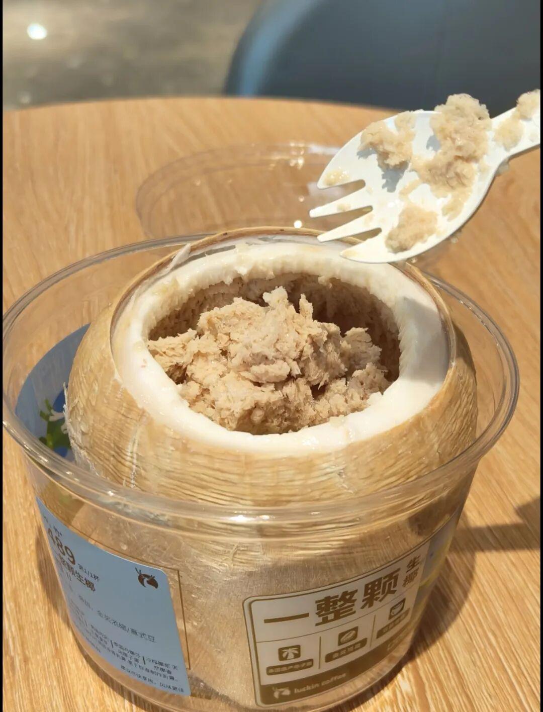 3月30日,瑞幸“一整颗生椰”正式上线,小程序16.9元一颗,门店每天限量出售。产品不是简单“加个椰子元素”,而是一整颗速冻椰子蛋作为原料直接使用,选用泰国丹嫩莎朵椰,出品时将椰浆、椰子水和浓缩咖啡融合摇匀,再倒入椰子蛋中。