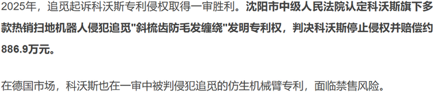 另一方面,科沃斯在专利纠纷中屡屡受挫。结合天眼查及《磐石之心聊财经》报道,2025年追觅起诉科沃斯专利侵权取得一审胜利,沈阳市中级人民法院认定科沃斯旗下多款热销扫地机器人侵犯追觅“斜梳齿防毛发缠绕”发明专利权,判决科沃斯停止侵权并赔偿约886.9万元。