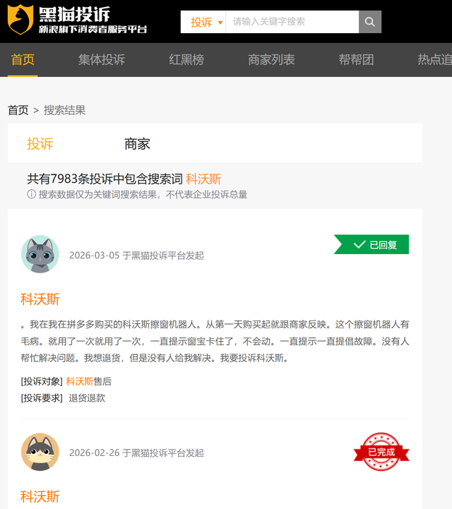 据黑猫投诉平台数据显示,截至2026年3月底,科沃斯相关投诉量累计近8000条,加上其子品牌添可,投诉总量已超过14000条。消费者投诉主要集中在产品质量问题、保修期内故障频发、售后维修不透明等方面。