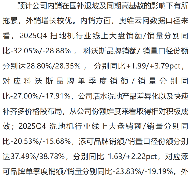 长江证券研报指出,2025Q4科沃斯品牌内销销额同比下滑27%,添可品牌同比下滑23.83%。奥维云网数据显示,2025Q4扫地机行业线上大盘销额同比下滑32.05%,洗地机行业线上大盘销额同比下滑20.53%。