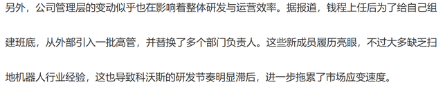 管理层变动频繁影响了整体研发与运营效率。据《银杏科技》等媒体报道,钱程上任后为了组建自己的班底,从外部引入一批高管,并替换了多个部门负责人。这些新成员虽然履历亮眼,但大多缺乏扫地机器人行业经验,导致科沃斯的研发节奏明显滞后,进一步拖累了市场应变速度。